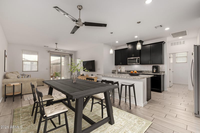 Inside, wood-look tile flooring flows throughout the main living areas, creating a clean, cohesive feel that is both durable and elegant. The kitchen serves as the heart of the home, featuring striking black cabinetry, a classic white subway tile backsplash, granite countertops, stainless steel appliances, a spacious island with custom pendant lighting, a walk-in pantry, and a built-in gas cooktop paired with a separate wall oven for a true designer touch.
