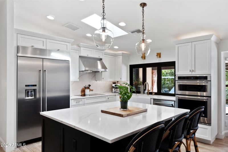 Listing details for 1441 Caroline Ln, Tempe, AZ 85284 : This stunning single-level Tempe home was thoughtfully redesigned in 2020 into a modern, open-concept showpiece. Situated on a large corner lot with no HOA, every inch of the layout has been optimized, creating a perfect blend of style, comfort, and functionality. Featuring an attached CASITA! The heart of the home is the chef's kitchen, featuring KitchenAid appliances, an induction cooktop, quartz countertops, a butler's pantry, and convenient power outlets above and below the counters. The details throughout this home are noted the moment you walk through the doors, recessed lighting, and tile plank flooring throughout adds architectural interest and sophistication. The oasis awaits in the backyard, as you enter via accordion glass doors that open fully to the backyard, seamlessly blending indoor and outdoor living. Step outside to your private resort-style retreat featuring a redone pool and spa with new plaster and decking, an outdoor grilling area, landscape lighting, and a drip irrigation system. Major system upgrades include a durable metal roof with foam insulation (2020), two high-efficiency 17 SEER HVAC units installed in 2020, and an 80-gallon water heater. The home also features a whole-house water softener, reverse osmosis in the kitchen, a redesigned HVAC system, and a hot-water recirculation system for faster delivery to the primary bath. All bedrooms feature walk-in closets, and the home includes a versatile attached casita and guest space of approximately 400 sq ft with its own bedroom and full bathroom, accessible from the garage or backyard--ideal for guests, multi-generational living, or a private office.