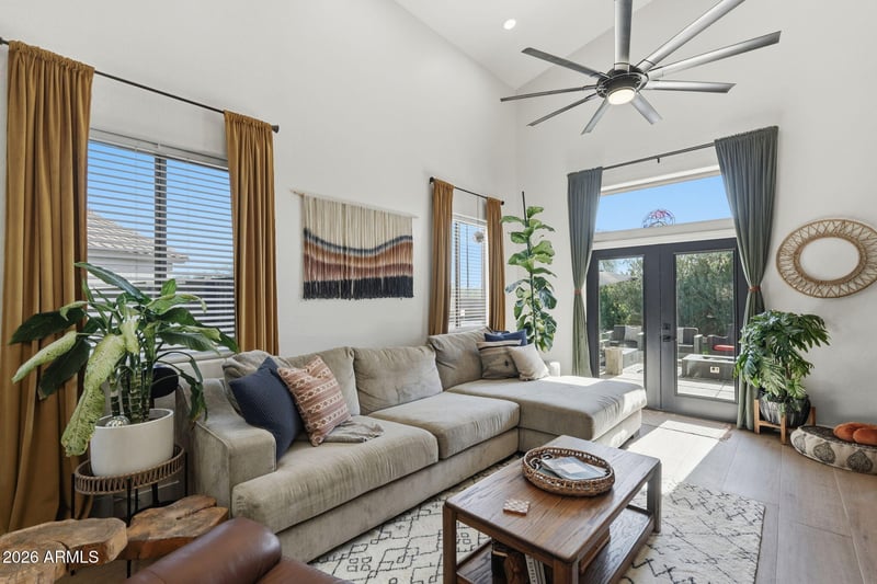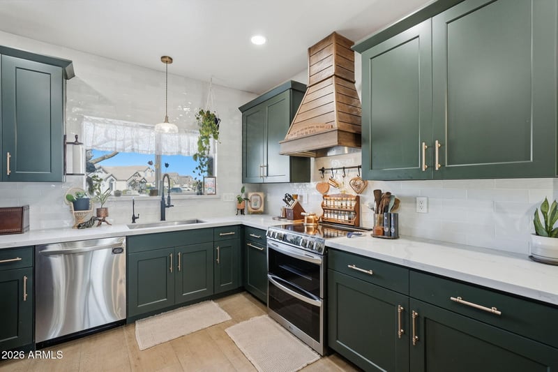 Listing details for 14447 87th Ave, Peoria, AZ 85381 : Exquisitely remodeled 2-story, 4-bedroom, 2.5-bath residence located in the sought-after Desert Harbor community of Peoria. Set on an oversized corner lot, this home seamlessly blends elevated design, thoughtful functionality, and inviting warmth—delivering a truly turnkey living experience. The main level showcases all-new wood-look tile flooring, fresh interior and exterior paint, new baseboards, upgraded lighting, and new ceiling fans throughout. The dramatic living room serves as a striking focal point, featuring a brand new custom two-story fireplace with electric insert, flanked by new built-in cabinetry and enhanced by newly added recessed lighting for an airy, light-filled ambiance. The kitchen has been beautifully reimagined with refaced cabinetry and custom hood, a full-height marble backsplash, upper cabinetry, and an integrated hanging rod. Upstairs, plush new carpeting extends through all bedrooms, while both full bathrooms have been completely remodeled. The primary suite is a serene retreat, featuring a spa-inspired bathroom with custom walnut reeded cabinetry, black granite countertops, gold fixtures, Bluetooth speaker exhaust fan, layered accent and recessed lighting, and an expansive two-person walk-in showereach side offering independent temperature controls, dual shower heads, including rain head and handheld wand. A generous walk-in closet and reeded glass windows complete the space. The secondary bathroom features a new soaking tub, floor-to-ceiling tiled shower walls, black fixtures with rain head and handheld wand, designer cabinetry with added pantry storage, and statement accent tile flooring. Recent major improvements include a new roof and water heater (2023), new insulated garage door and motor, garage shop sink with added cabinetry, all new outlets and screw-less switches, and Low-E windows. Outdoors, the backyard has been thoughtfully enhanced with five newly planted ficus trees for added privacy and two custom raised garden bedscreating a peaceful, functional outdoor setting. With extensive upgrades, designer finishes, and a prime corner-lot location, this exceptional home offers refined living in one of Peoria's most desirable neighborhoods.