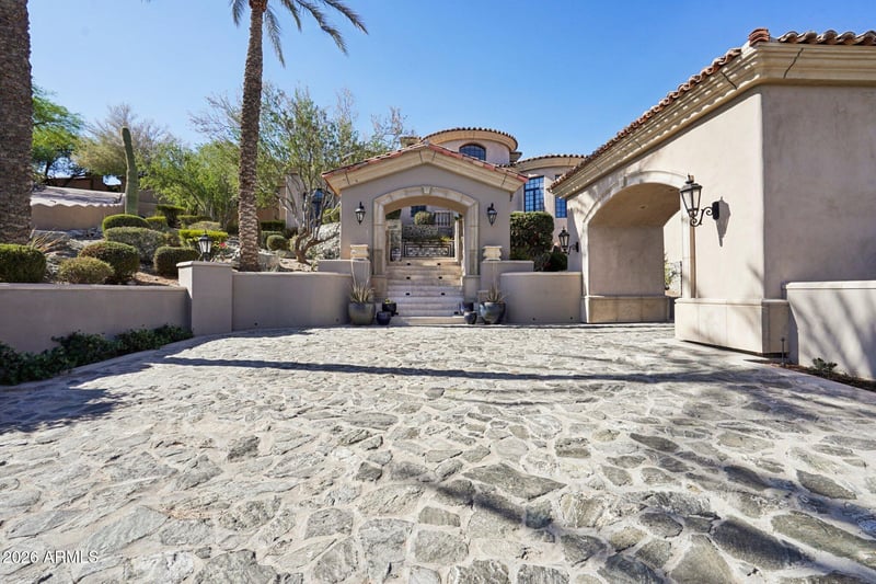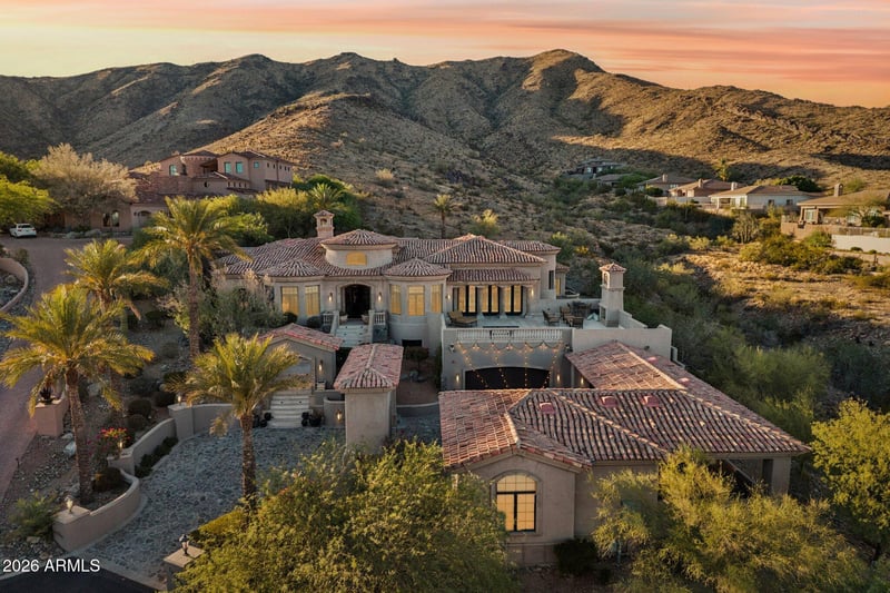 Listing details for 14603 1st St, Phoenix, AZ 85048 : Extraordinary luxury estate blending timeless craftsmanship with refined living in one of Ahwatukee's most desirable settings. Rich details include distressed brick, hardwood flooring, Venetian plaster walls, custom cabinetry, designer lighting, whole-home audio plus Lutron system. Gourmet kitchen features Wolf appliances, Sub-Zero refrigeration, dual dishwashers, oversized island, breakfast bar, complemented by butler's pantry. Family room opens to expansive deck. Five ensuite bedrooms include serene primary retreat with spa bath and private patio access. A 1,589 sq ft basement offers circular bar, theater, and music room. Stunning resort-style backyard with pool, spa, waterfall, Viking BBQ, fireplace, travertine patio. Extensive garages complete this one-of-a-kind, exceptional offering. Extraordinary Desert Estate | Unrivaled Craftsmanship & Resort Living A rare offering of timeless design and uncompromising quality, this exceptional luxury estate blends old-world craftsmanship with modern sophistication in one of Ahwatukee's most coveted settings. Every detail has been thoughtfully curated--from inlaid distressed brick and vintage Virginia barnwood flooring to hand-applied Venetian plaster walls--creating a home that is both warm and architecturally striking. Inside, rich textures and custom finishes define every space. Solid wood core doors, furniture-grade cabinetry, 9-inch baseboards, plantation shutters, and designer lighting elevate the home throughout, while an integrated Lutron lighting system and whole-home audio provide effortless ambiance and control. Designed for both intimate living and grand entertaining, the home features a formal living and dining room with a stunning fireplace and built-in hutch, a welcoming family room with custom built-ins that opens to an expansive deck with its own fireplace, and a richly appointed library with wood ceiling. A dedicated piano room adds an elegant, refined touch. At the heart of the home, the gourmet kitchen is a true showpiece--complete with Wolf gas cooktop, double Wolf ovens, Sub-Zero refrigeration, dual dishwashers, ice maker, two trash compactors, an oversized island, and an expansive breakfast bar. A fully equipped butler's pantry with sink and additional dishwasher, along with a dumbwaiter for seamless service, enhances both functionality and entertaining. The adjacent laundry room is equally impressive, featuring abundant storage, a central island, and a custom sewing area. All five bedrooms are generously sized ensuite retreats, complemented by a total of 7.5 beautifully appointed baths. The primary suite is a private sanctuary, offering a serene sitting room, direct access to the patio and pool, a spa-inspired bath with an exquisite walk-in shower, and a custom-designed closet with glass-front cabinetry and its own stacked washer and dryer. The lower-level transforms into an entertainer's dream. Spanning 1,589 square feet, the basement features a dramatic circular wet bar with a soda shop experience, projector media space, soundproof music room, and a full bath--perfect for hosting on any scale. Car enthusiasts and hobbyists will appreciate the extensive garage accommodations, including a 3-car attached garage with air conditioning, stainless-steel workbench, and two large storage rooms, a 2-car detached garage, plus a 2-car covered carport. Both garages are outfitted with epoxy flooring, built-in cabinetry for ultimate functionality. A separate guest house offers 448 square feet of private accommodations, complete with built-ins, a Murphy bed, and a full bath--ideal for visitors or extended stays. Outdoors, the property transforms into a true resort retreat. Expansive travertine patios, a wrap-around covered patio, Viking barbecue, and outdoor fireplace set the stage for unforgettable gatherings. The sparkling pool and spa, enhanced by a tranquil waterfall feature, create a serene escape framed by the beauty of the desert landscape. This is more than a home -- it is a statement of luxury, craftsmanship, and lifestyle at its finest.