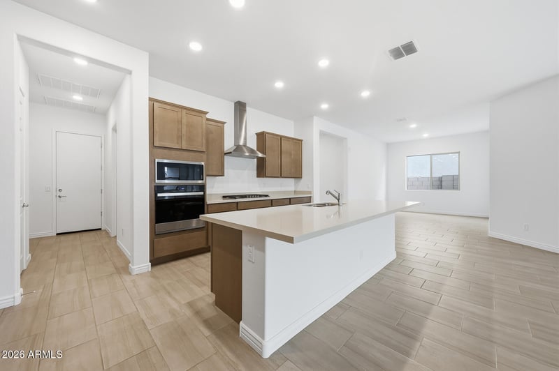 Listing details for 14849 Lariat Trl, Surprise, AZ 85387 : Welcome to this beautifully designed 5-bedroom, 3.5-bath home that perfectly blends style, comfort, and functionality. The gourmet kitchen is a true showpiece, featuring elegant white shaker cabinets, quartz countertops, a sleek grey backsplash, and high-end finishes throughout. Wood-look tile flooring flows seamlessly through the main living areas, while plush carpeting adds warmth and comfort to the bedrooms. The spacious floor plan offers versatility and privacy, with two bedrooms and a private living area located at the back of the home deal for guests or multigenerational living. Two additional bedrooms share a full bath at the front of the house, along with a welcoming den that's perfect for a home office or flex space. The luxurious primary suite includes a custom-tiled shower.