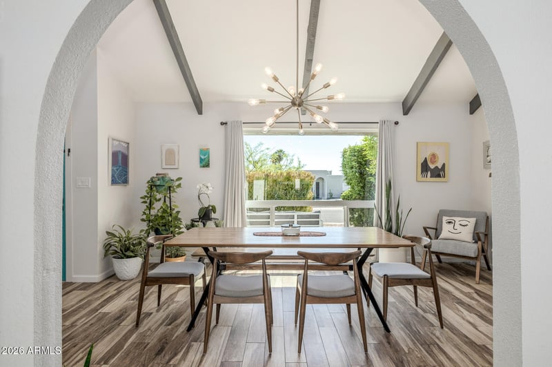 Listing details for 15046 20th Pl, Phoenix, AZ 85022 : Home, Sweet Home! This beautifully enhanced 3-bedroom, 2-bath residence welcomes you with a 2-car garage, RV gate, breathtaking mountain views, and a charming, thoughtfully designed front patio--perfect for enjoying Arizona's stunning sunsets. From the moment you step inside, you're greeted by an enchanting living and dining space highlighted by soaring vaulted ceilings with exposed beams, NEW clerestory windows that flood the home with natural light, designer lighting, and rich wood-look flooring that adds warmth and sophistication throughout.