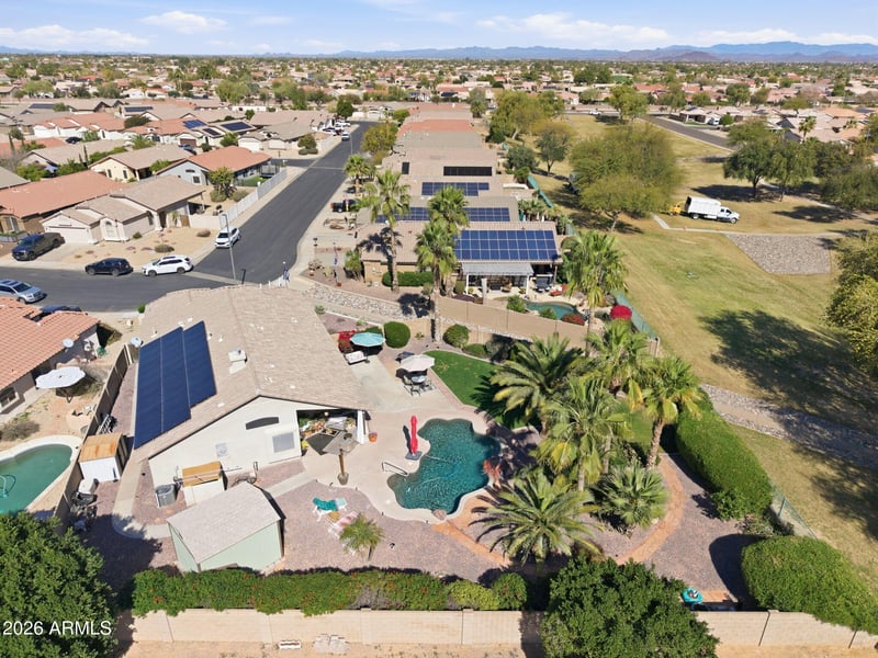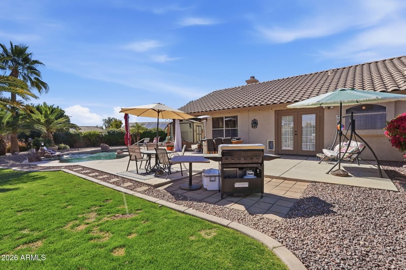 Listing details for 15101 Eureka Trl, Surprise, AZ 85374 : Beautiful 3-bedroom, 2-bath home in Surprise with a versatile den ideal for an office or optional 4th bedroom. Excellent curb appeal with manicured evergreens, low-maintenance gravel landscaping, a 2-car garage, and leased solar for energy efficiency. Inside features vaulted ceilings, formal living and dining areas, tile and laminate flooring, and a cozy family room with fireplace. The kitchen offers stainless steel appliances, ample cabinetry, solid surface countertops, and a center island with breakfast bar. The spacious primary suite includes a walk-in closet, dual vanities, soaking tub, and private backyard access. Enjoy a resort-style backyard with a sparkling pool, fire pit, and large private space perfect for relaxing or entertaining.