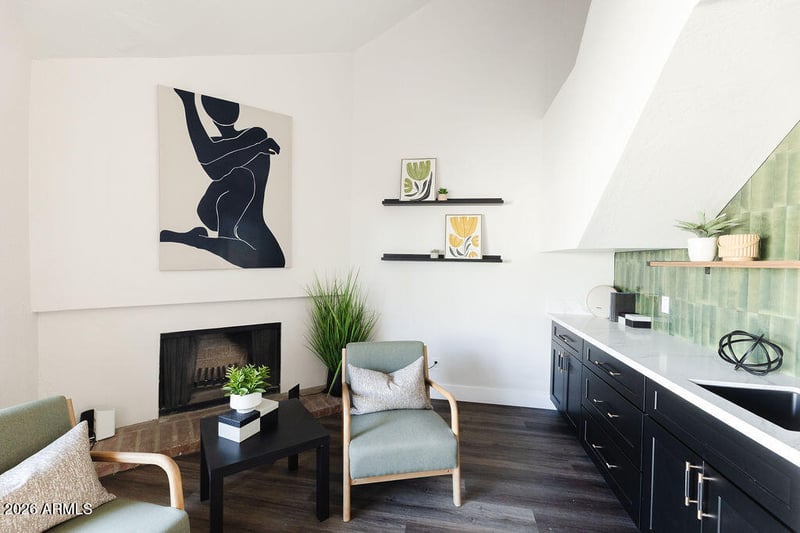 With 1,627sf and a fantastic, open floorplan, the home was thoughtfully redesigned to create bright, connected living spaces. The all-new kitchen opens seamlessly to the dining area and greatroom features updated modern cabinetry, quartz countertops, black shiplap breakfast bar seating, new appliances, pantry cabinet storage, and sleek modern finishes. Vaulted ceilings add architectural charm and enhance the spacious feel! Luxury vinyl plank flooring throughout is durable and on-trend. Lounge in the cozy fireplace area which showcases original vintage brick, bringing character to the space, while the updated wet bar features updated cabinetry, brass hardware, and designer tile.