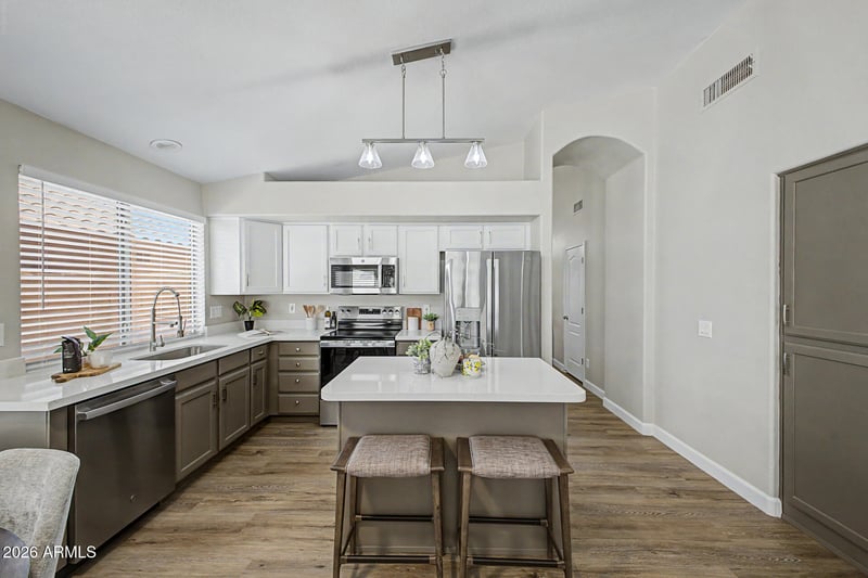 Listing details for 15208 Eureka Trl, Surprise, AZ 85374 : Beautiful updated single-level home with POOL! Offering 3 beds, 2 baths, and a 2-car garage with BUILT-IN STORAGE. This move-in ready home has been recently renovated throughout, featuring a stunning kitchen with brand new QUARTZ COUNTERS and all new SS appliances. The inviting interior showcases vaulted ceilings, tons of natural light, a neutral freshly painted palette throughout, and brand new wood-look flooring with soft carpet in bedrooms. The seamlessly flowing living & dining room is paired with a bay window, and the separate family room features a cozy FIREPLACE. The primary suite includes a WALK-IN CLOSET and a beautifully updated ensuite with dual sink, a separate tub and shower, and direct backyard access. The guest bathroom is tastefully upgraded and features a brand new walk-in shower. Enjoy the backyard oasis featuring a covered patio, a fully functioning MISTING SYSTEM, extended seating areas, and a private POOL, fully ready for a hot tub. Exterior painted in 2024 adds to the home's fresh, well-maintained appeal. Move-in ready!