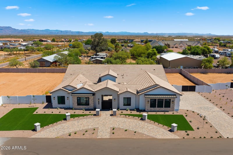 Listing details for 15243 229th Ter, Mesa, AZ 85212 : Stunning custom 4,581 sq ft home featuring a charming courtyard and a striking brick veneer with board-and-batten façade. The kitchen is equipped with premium Wolf appliances and a Sub-Zero refrigerator, perfect for both everyday living and entertaining. The spacious great room showcases a custom fireplace wall as a beautiful focal point.