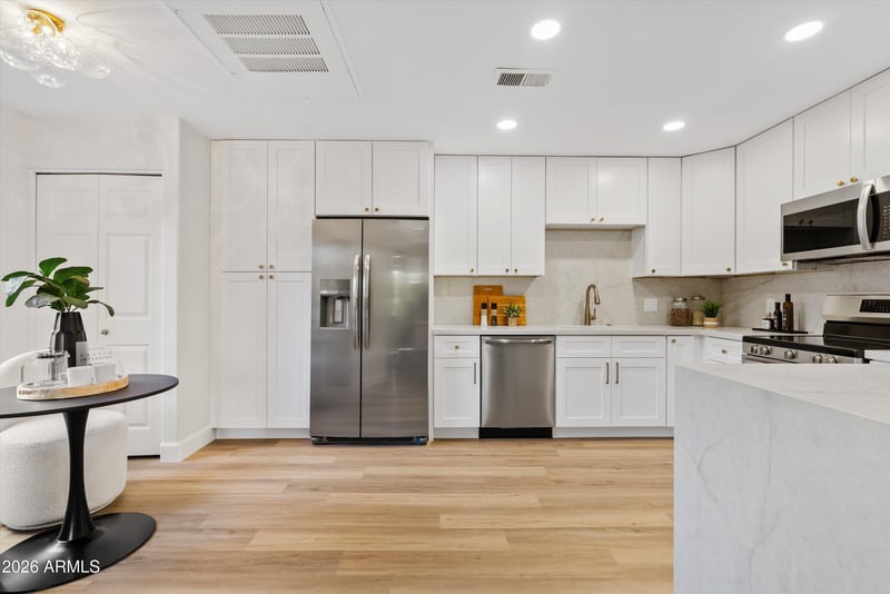 Listing details for 15252 100th St #1172, Scottsdale, AZ 85260 : STUNNING 2 bed/2bath with a den (large enough to be a 3rd BR), ground level unit with no interior stairs. FULL RENOVATION, professionally designed, completed October 2025. Large, wrap around patio faces pool & open grassy area. Brand new everything! Luxury vinyl tile throughout. Kitchen has white shaker cabinets with 42'' uppers for that custom look, brand new SS appliances & quartz countertops. Primary bathroom is a dream with custom tile, oversized walk in shower, quartz countertops, and two vanities. Fireplace with tile surround for that cozy, modern look. Perfect location! Across the street from Horizon Park (dog park & pickle ball!). Close to WestWorld, WMO golf tournament, Kierland, Scottsdale Quarter, restaurants, Starbucks, grocery store, dining & more!