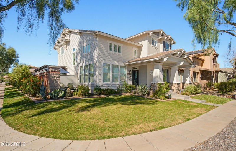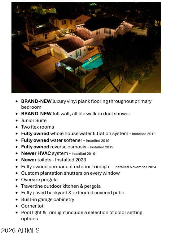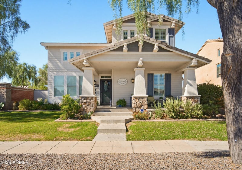 Listing details for 15294 Old Oak Ln, Surprise, AZ 85379 : ASSUMABLE LOAN WITH A 2.99% INTEREST RATE! Beautiful Ashton Woods Craftsman style corner lot located in charming Marley Park! This 4-bed, 3.5-bath home offers vaulted ceilings, custom plantation shutters throughout, a junior suite, two flex rooms, formal dining, newer tankless water heater, fully owned water softener, reverse osmosis and whole house water filtration system. The newly installed permanent Trimlight wraps around the entire roof exterior and includes a selection of ambient lighting options for every occasion! The kitchen boasts white quartz countertops, an oversize island, and stainless-steel appliances. Brand-new luxury vinyl plank flooring throughout the primary suite and walk-in closet, accompanied by a spacious private bathroom with dual sinks and a newly remodeled walk-in tile shower. Make your way out back through the family room French doors where you will be greeted to an elegantly shaded and paved backyard offering plenty of entertainment space, sparkling Pebble tec pool, oversize pergola, and outdoor travertine kitchen. Here you will have easy access to Loop 303 and will be conveniently located near Prasada; Surprise's newest shopping, dining and entertainment spot!