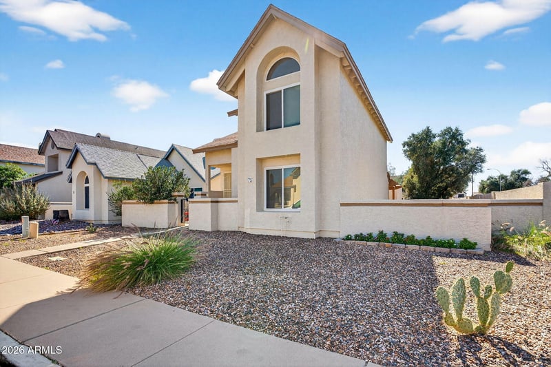 Listing details for 1535 Horne -- #75, Mesa, AZ 85203 : Located on a desirable corner lot within walking distance to the community pool, this move-in ready home offers a functional and flexible layout ideal for everyday living. The great room floor plan includes 1 bedroom and full bath downstairs, perfect for guests or multi-generational needs, with 2 bedrooms and a Jack-and-Jill bathroom upstairs. Interior features include vaulted ceilings, extensive tile flooring, and brand-new carpet and pad. A real wood-burning fireplace anchors the living area, adding warmth and character. The kitchen is designed for convenience with a breakfast bar, island, pantry, and stainless-steel appliances. Both bathrooms include tile surround showers/tubs, and the home also offers an inside laundry room for added functionality. Step outside to a covered patio &... low-maintenance backyard, plus an RV gate with concrete pad for additional parking or storage. A 2-car garage completes the package. If you're searching for a corner lot home with downstairs bedroom, RV gate, and community pool access, this clean, move-in ready property checks all the boxes.