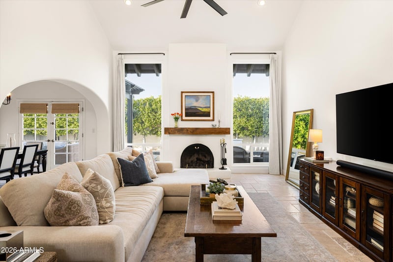 The split floor plan offers both privacy and flexibility, with two spacious bedrooms plus a dedicated office that's perfect for working from home, creative projects, or even a third guest space. The primary suite is a true retreat- oversized and inviting, complete with its own beehive fireplace, private patio access, a beautifully remodeled ensuite bath, and walk-in closet. The guest suite doesn't disappoint, featuring its own ensuite bath, walk-in closet, and charming arched windows that bring in soft natural light and architectural character.
