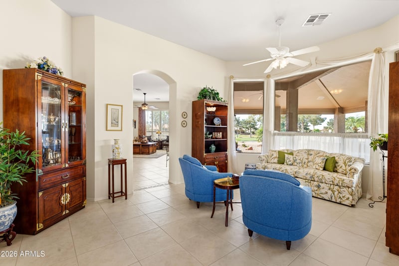 Listing details for 15551 Piccadilly Rd, Goodyear, AZ 85395 : Beautifully upgraded 3 bed, 2 bath home situated on the 3rd hole of the EN Golf Course with stunning sunsets and serene golf course views. Owned SOLAR and numerous updates throughout. Bathrooms refurbished in 2023, including redesigned primary bath with raised sink counters with stunning neutral quartz and updated toilets in both baths. Upgraded wood cabinets, quartz counters, new Bosch dishwasher & GE fridge. Thoughtfully designed 18x18 diagonal tile flooring, plantation shutters sunscreens, and roll-up shades in all the right places. Enjoy outdoor living with extended back patio, built-in BBQ, or retreat to the charming front sitting area with a trickling water feature--perfect for morning coffee. Major updates include new exterior paint (2019), A/C (2017), new washer/dryer (2025). This very Active Adult community includes 3-18 hole golf courses, 40+ pickleball & tennis courts, State of the Art Fitness Centers, Creative Arts Center, Multiple resort style pools and hot tubs, Theater with live performances, Casual dining, Billiards room, Bocce courts and more. Come take a look!