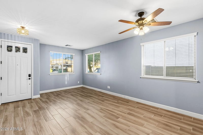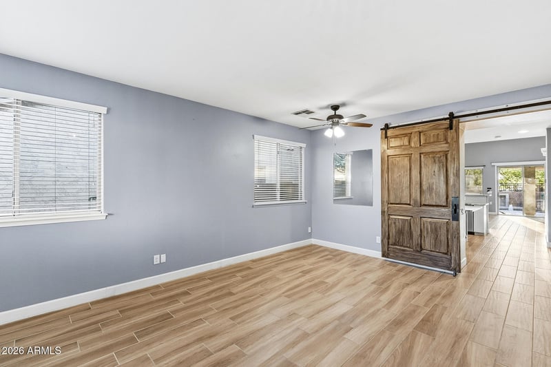 Listing details for 1556 Chaparral Blvd, Gilbert, AZ 85296 : Stylish Space & Soaring Ceilings! Formal living & dining areas sit just off the front entry, highlighted by wood-like tile flooring throughout the downstairs. A sliding barn door adds character & provides stylish separation from the fully remodeled kitchen featuring stainless appliances, gas cooktop, wall oven, center island, granite countertops & custom tile backsplash, all opening seamlessly to the family room with soaring two-story ceilings, oversized windows & a striking statement staircase. The downstairs primary suite is expansive with walk-in closets & a beautifully remodeled ensuite showcasing a multi-function shower, free-standing tub, double vanity & extra storage, with laundry conveniently located downstairs. Upstairs offers a large loft for flexible use. The backyard features a 2017 installed pool with Baja shelf & waterfalls, outdoor kitchen with built-in gas grill, side burner & sink, firepit, plus front perimeter permanent lighting. Additional highlights include a soft water carbon filtration system, reverse osmosis, tankless water heater, newer Trane AC units (both under 4 years old), exterior paint just 2 years old, garage with epoxy floors, built-in cabinets, work bench & overhead storage racks. Located in a community with parks, playgrounds & community pool, with easy access to Loop 202 plus nearby shopping, dining & recreation -- this home truly delivers on upgrades, comfort & location.