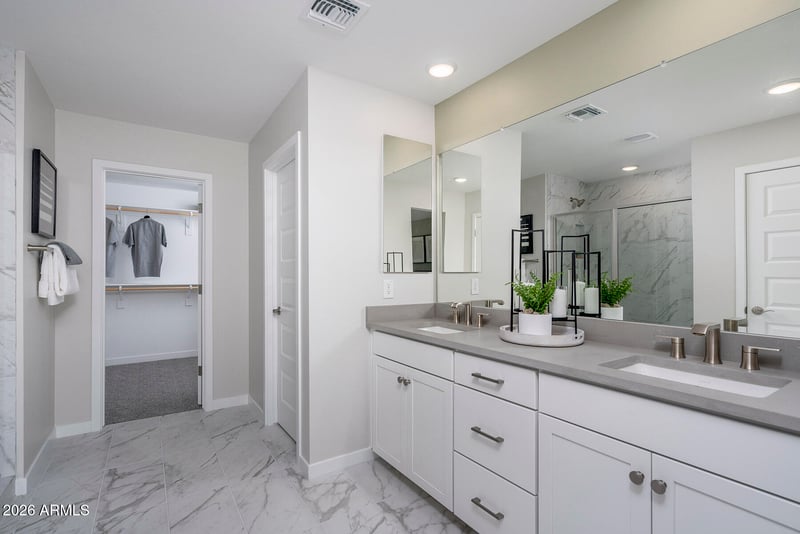 Listing details for 15596 180th Ln, Goodyear, AZ 85338 : Fully upgrade former model home. This 4 bedroom 3 bath home will not disappoint. Home is situated on the large green belt common space. First floor is completely open with room for everyone. Kitchen looks out to the living room with a large island and plenty of counter space. 42 inch white cabinets with plenty of storage. Other finishes include dark solid quartz countertops and subway backsplash. There is a first floor tiled bedroom and full bathroom to complete the first floor. Upstairs, there is a large loft, 2 guest bedrooms, a guest bathroom, upstairs laundry room with sink and cabinets. Large primary suite with large closet, walk in shower and dula vanities. Call Estrella home today!