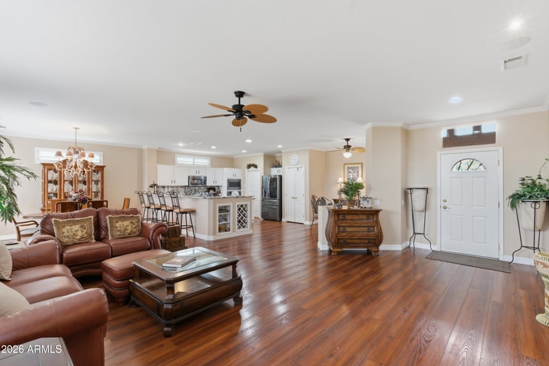 Listing details for 15623 Bethesda Ct, Surprise, AZ 85374 : HIGH-EFFICIENCY CHOLLA MODEL WITH GUEST CASITA & SUPERB VIEWS! Experience the gold standard of desert living in this meticulously upgraded residence in The Grand's Quail Run. Offered with the majority of furnishings, this home is a masterpiece of efficiency featuring Andersen windows, superior insulation, and plantation shutters. The 2,181 sqft total living space (1,934 main/247 casita) boasts a NEW 2025 roof, wood plank flooring, and crown moulding. The chef's kitchen with granite and LG SS appliances flows into formal dining and a private office. Enjoy a climate-controlled garage with built-in storage. Situated on an oversized 11,247 sqft corner lot with a south-facing paver patio and a private gated courtyard that leads to your guest casita. Move-in ready perfection! Living within The Grand (Sun City Grand Quail Run) provides world-class amenities. This premier 45+ community feels more like a resort than a standard neighborhood. GOLF: Take your pick of four championship courses: Cimarron, Desert Springs, and the 36-hole Granite Falls complex. FITNESS: Access to the Adobe and Cimarron centers includes resort-style pools, a state-of-the-art indoor walking track, and the Cimarron Day Spa. LIFESTYLE: Stay busy with 22 pickleball courts, tennis, softball, billiards and over 100 chartered clubs. The Lifelong Learning Academy is also right here for those who want to keep growing. SOCIAL: Golf-cart-friendly streets lead to the community's favorite social hubs--Angela's Kitchen and Maple & Rye (at Granite Falls)--along with a boutique library and miles of scenic trails. ADDITIONAL HOME FEATURES: TOTAL LIVING AREA: 2,181 sqft (1,934 main house + 247 detached casita). INFRASTRUCTURE: New Roof (May 2025), high-performance Andersen windows, and a hot-water recirculation system. GARAGE: Fully climate-controlled with a mini-split system, epoxy floors, insulated door, and extensive built-in storage cabinets. GUEST CASITA: The detached 247 sqft guest house is located off the private, gated courtyard. It's fully furnished and ready for guests or a dedicated hobby studio.