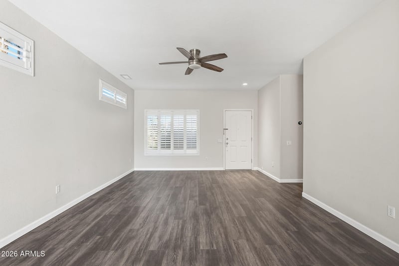 Listing details for 15735 Arrowhead Dr, Surprise, AZ 85374 : Thoughtfully updated and beautifully maintained, this move-in ready Cedar model offers modern comfort with timeless style throughout. The kitchen has been completely refreshed with quartz countertops, a stainless steel Samsung appliance package, new sink and faucet, updated cabinetry, and an eye-catching glass tile backsplash extending to the ceiling. Vinyl plank flooring flows through the entire home — no carpet — complemented by craftsman-style baseboards, plantation shutters, and contemporary ceiling fans and lighting for a beautiful flow. Bathrooms have also been renovated with quartz counters, new vanities, updated fixtures, enhanced lighting, and decorative wainscoting. The spacious primary suite features an ensuite bath with dual vanities and a big walk-in closet. The secondary den/bedroom is highlighted by charming barn doors and an armoire. A lovely, generously sized, fenced backyard has electric roll-down sunshades on all three sides of the extended covered patio perfect for enjoying the outdoors year-round. The two-car attached garage has built-in storage cabinets. A wonderful opportunity for stylish, low-maintenance living in The Grand.