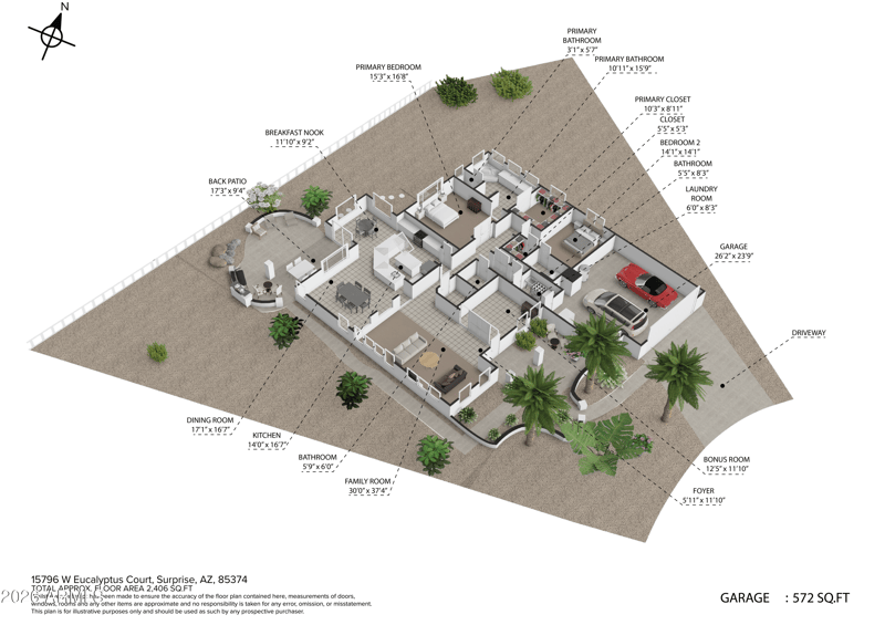 Listing details for 15796 Eucalyptus Ct, Surprise, AZ 85374 : Attractive 2400+ Sq.Ft Home Is Perfect For Gathering Family & Friends And Features 2 Master Suites, Den/Office, 2.5 Bathrooms, 2.5 Car Garage On A HUGE 1/4 Acre Cul-De-Sac Lot. BRAND NEW ROOF, INTERIOR PAINT, CARPET & NEWER HVAC UNITS (2025/2020). Popular Jasmine Floor Plan Offers LOTS of Natural Light, Spacious Living Areas, HUGE Kitchen with TONS Of Cabinets & Counter Space, An Island, Newer Refrigerator (2025), Reverse Osmosis Water Filtration System & Cozy Breakfast Area. Two Master Suites Are Spacious and Feature Walk in Closets. The Den/Office Can Easily Be Converted to 3rd Bedroom. The Extended 2.5 Car Garage Offers Built In Cabinets & 2 Work Benches. Oversized Covered Patio Features Multiple Lounging & Dining Areas. Great Location Close to Popular Amenities & Golf at The Grand.