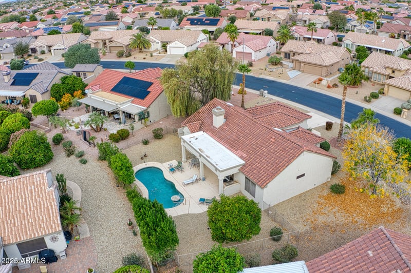 Listing details for 15815 Wildflower Dr, Surprise, AZ 85374 : Popular Palo Verde floor plan in Sun City Grand offering 1,850 square feet with 2 bedrooms, 2 baths, and a desirable split-bedroom layout. The primary suite is privately positioned on the opposite side of the home from the guest bedroom and den/office. This well-maintained home features a new roof underlayment, newer HVAC system, bay windows in both the primary bedroom and breakfast nook, and skylights in the kitchen and primary bath that enhance natural light. A rare and highly sought-after feature includes privacy doors to the primary bathroom. The backyard is a true retreat, showcasing a private pool surrounded by thoughtfully placed mature landscaping that provides exceptional privacy. This beautifully maintained Palo Verde model offers one of the most sought-after floor plans in Sun City Grand, combining comfort, privacy, and classic Arizona indoor-outdoor living. With 1,850 square feet, this 2-bedroom, 2-bath residence plus den/office is thoughtfully designed with a split-bedroom layout, placing the primary suite on the opposite side of the home from the guest bedroom and flex spaceideal for hosting visitors, working from home, or enjoying quiet personal retreats.