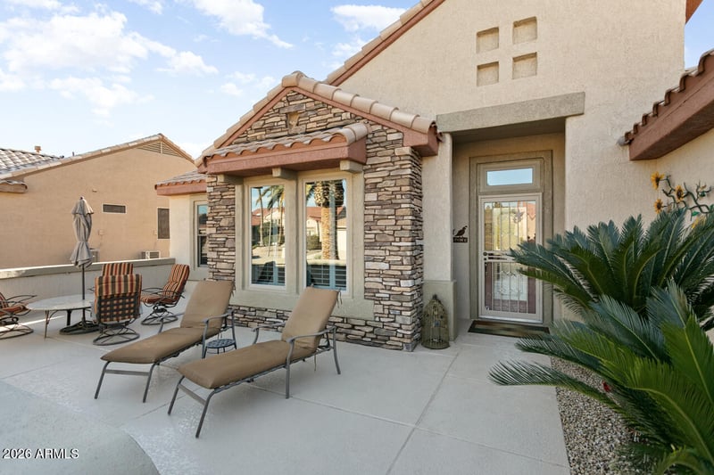 Listing details for 15837 Silver Breeze Dr, Surprise, AZ 85374 : Beautifully upgraded Palo Verde. The curb appeal is special w/ a front courtyard & stone veneer and water feature. This split 2 bedroom, 2 bath home also offers a flexible den/office.Notice the beautiful crown molding! Kitchen features granite countertops, breakfast room, SS appliances, breakfast bar, pull-out drawers & shaker cabinet fronts. Primary suite has a bay window, updated bathroom w/ double sinks, granite counters & tiled shower. Guest bathroom was updated with granite counters & tiled shower. Inside laundry has cabinets for added storage. Plantation shutters on the Anderson windows, offer style and function. Roof (2022) Water heater (2020) HVAC (2025), RO,.Exterior Paint (2025). Extend your living area on this welcoming back patio w/ soothing water feature, built-in-BBQ, misting system & lush landscaping