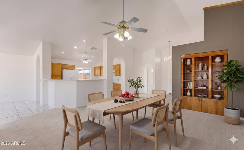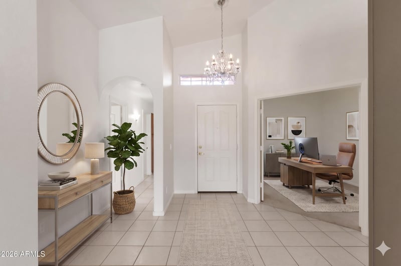 Listing details for 15877 161st Dr, Surprise, AZ 85374 : Move-in ready single-story home in Surprise featuring 3 bedrooms, 2 bathrooms, plus a dedicated office/den and 1,884 sq ft of living space. The open floor plan boasts vaulted ceilings and large windows for abundant natural light. The kitchen includes ample cabinet storage, extended counter space, and white appliances, opening seamlessly to the main living and dining areas. The primary suite offers private backyard views, while the secondary bedrooms are split for added flexibility. A separate office provides the ideal space for remote work, a hobby room, or guest use. Multiple sliding glass doors provide direct access to an incredible outdoor living area. The massive, ultra-private backyard features no neighbors behind the home, offering unparalleled privacy. Enjoy year-round entertaining