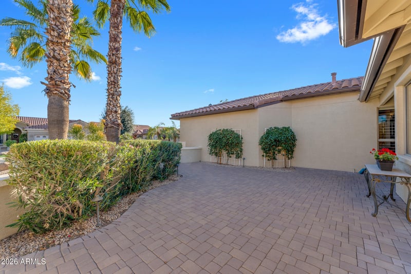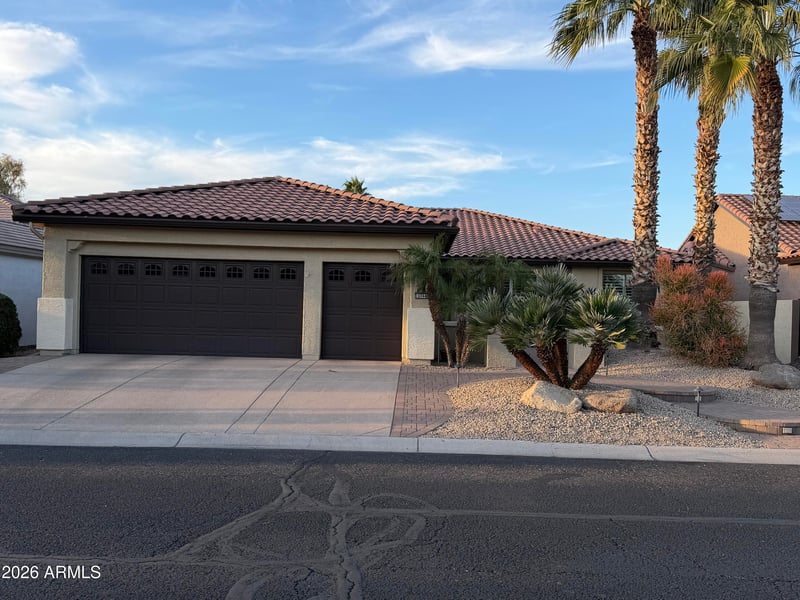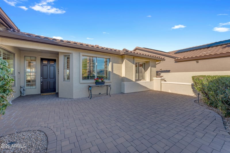 Listing details for 16044 Cambridge Ave, Goodyear, AZ 85395 : Nicely upgraded and impeccably maintained golf course home located on the Tuscany Falls side of the award-winning PebbleCreek active adult community in Goodyear, Arizona. From the moment you arrive, the paver front walkway and elegant entry set the tone for the quality and care found throughout. This 2-bedroom plus den home offers thoughtful upgrades and designer touches at every turn. The spacious primary suite features a professionally crafted walk-in closet that is both beautiful and highly functional, while the den showcases custom-built-in cabinetry, perfect for a home office, library, or hobby space. The primary bathroom includes dual vanities and a walk-in tiled shower, creating a relaxing retreat. The professionally designed kitchen is a cook's dream, complete with a gas cooktop, two-tone quartz countertops, a large island with bar seating, custom cabinetry, and an additional built-in buffet and seating area, making it ideal for entertaining and everyday living. This home blends comfort, style, and functionality, while large windows invite natural light and showcase the serene golf course setting. Step outside to the private backyard oasis where you'll enjoy sweeping golf course views of the golf green and fairway, a covered paver patio with a built-in BBQ, and the perfect balance of sun and shade. Relax year-round in the spool (spa + pool) while taking in the serene PebbleCreek setting.