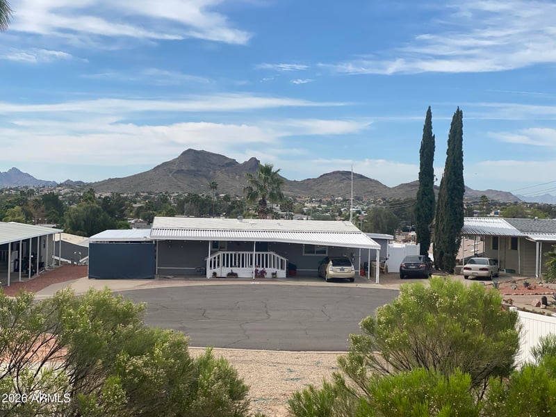 Listing details for 1611 Villa Rita Dr #113, Phoenix, AZ 85022 : AMAZING VIEW • OWNED SOLAR • NUMEROUS UPGRADES! This beautifully updated 2-bedroom, 2-bath, 1,152 sq ft manufactured home is nestled in a quiet cul-de-sac on one of the best lots in this desirable 55+ community. Step inside to find vaulted ceilings, recessed lighting, and a soothing, modern color palette complemented by stylish wood-look flooring. The open-concept floor plan connects a bright living space to a modern farmhouse kitchen complete with updated cabinetry, breakfast bar, and plenty of counter space. Both bathrooms feature spacious walk-in showers, newer sinks, and vanities. Enjoy morning coffee or evening sunsets from two resurfaced decks, each offering stunning views. The private yard includes space for gardening, a vinyl privacy fence, and parking for up to seven vehicles..