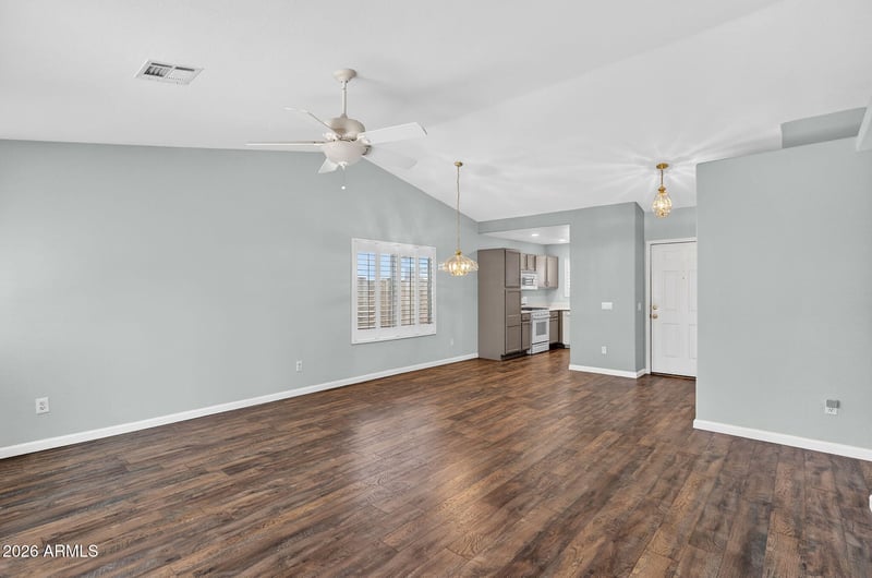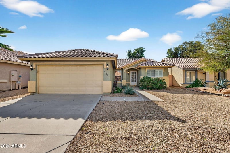 Listing details for 16113 Grant St, Goodyear, AZ 85338 : This 3 bedroom, 2 bathroom single-family home for sale in Goodyear, AZ featuring an open floor plan with vaulted ceilings and a bright living area. The kitchen includes ample cabinet storage, included appliances, and opens to the main living space. Sliding glass doors lead to the backyard, ideal for indoor-outdoor living with a large grassy yard. The primary bedroom offers a walk-in closet and remodeled bathroom. Low-maintenance desert landscaping and community amenities including walking paths, biking trails, and a playground. Convenient Goodyear location near the Goodyear Recreation Center, Desert Edge High School, BASIS, parks, shopping, and dining with easy access I10.