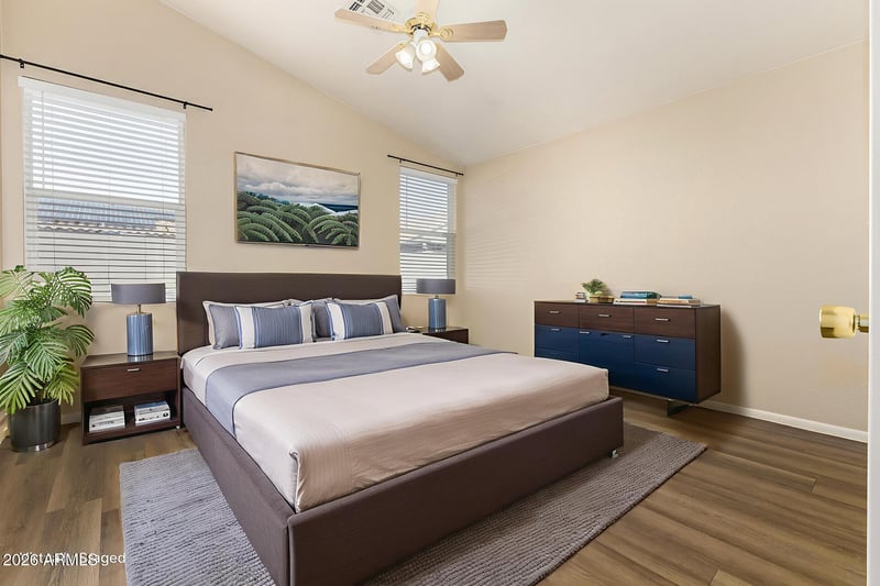 Listing details for 16144 Grant St, Goodyear, AZ 85338 : Tucked away at the end of a quiet cul-de-sac, this home is next to a large park and wash area. Open space to one side creates separation from neighboring homes for a more secluded feel. The primary bedroom features a private ensuite bath, and the refrigerator, washer, and dryer are included for added convenience. Ideally located near shopping, dining, and everyday amenities, this home blends comfort, privacy, and accessibility.
