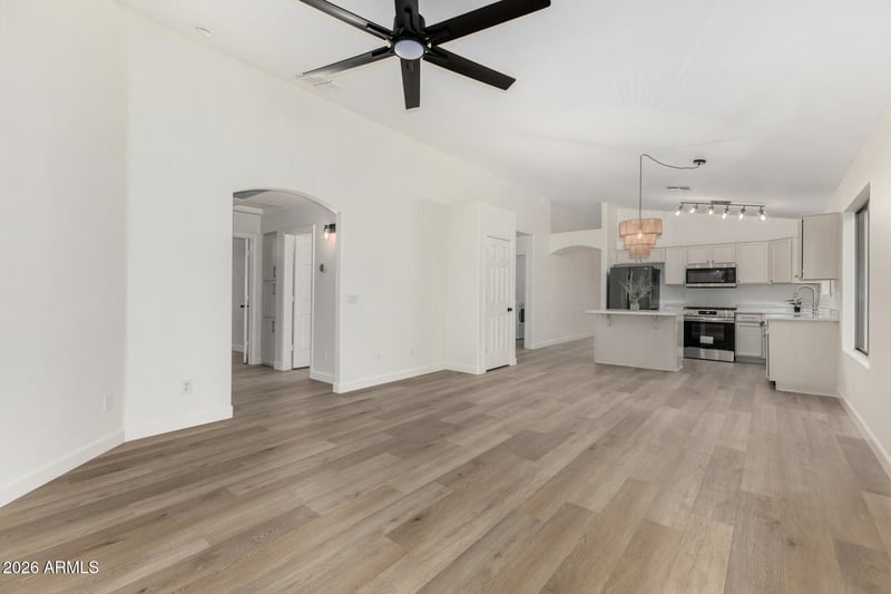 The kitchen, dining, and living spaces flow seamlessly, anchored by updated cabinetry, new quartz countertops, a stainless steel sink, and newer appliances including a gas stove and microwave. Throughout the home, you'll find new LVP flooring, updated baseboards, fresh interior paint, modern lighting, and updated fixtures and fans, creating a clean, cohesive look from room to room. Bathrooms have been upgraded with new vanities, and major systems have been addressed with a newer water heater (2025) and a newer AC unit (2021).