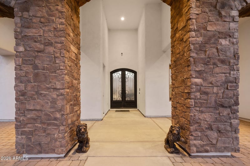 Arrival & Grounds: Entry begins through a secure gated compound featuring three vehicle gates, including a primary automated entrance that opens to a sweeping circular driveway and expansive motor court designed for ease of access and impressive arrival. Mature landscaping and shade trees frame the approach while the surrounding acreage provides separation from neighboring properties. Private road access enhances privacy and convenience. A private gate leads directly to the adjacent canal and trail system, offering opportunities for walking, cycling, and outdoor recreation. An elevated observation deck provides views of the surrounding landscape and nearby regional park lake while capturing sunsets and community events in the distance.