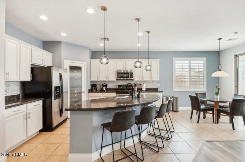 Listing details for 16523 Sherman St, Goodyear, AZ 85338 : Beautifully maintained 3-bedroom home in Canyon Trails, ideally situated on a private corner lot. The open kitchen features granite counters, an island, and flows into the family room. Perfect for everyday living and entertaining. Recent updates include new can lighting and a new hot water heater. The backyard is an entertainer's dream with paver patio areas, a heated pool, and an above-ground spa, ideal for relaxing or hosting year-round.