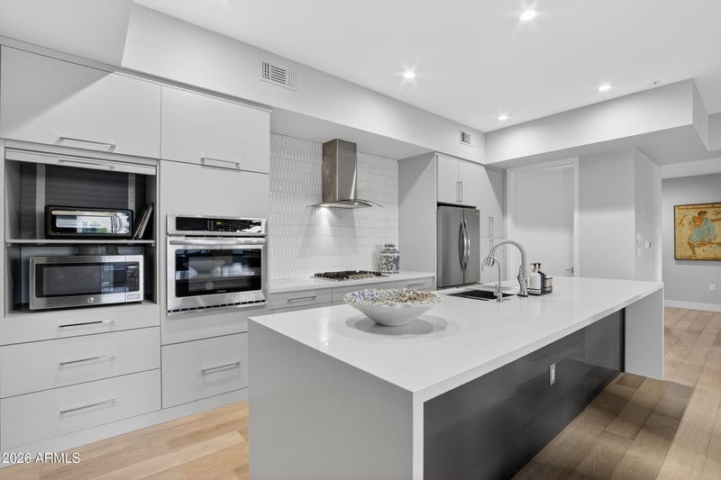Situated within the architecturally distinctive SOHO Scottsdale community designed by renowned architect Bing Hu, the residence offers a sleek, modern aesthetic and a light, contemporary feel throughout. This unit includes TWO SECURE UNDERGROUND PARKING SPACES plus a PRIVATE STORAGE UNIT, highly coveted features in this building.