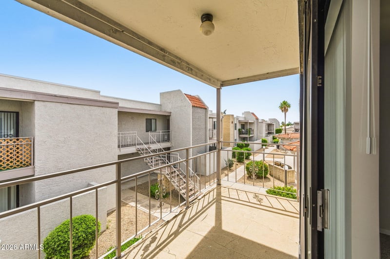 Listing details for 16635 Cave Creek Rd #215, Phoenix, AZ 85032 : Why Rent when You can Buy! Enjoy your community pool views right from your own Balcony. Kitchen features wood look vinyl plank flooring, black kitchen appliances, granite counter tops complimented with a stylish backsplash and a large pantry. Split floor plan features 2 bedrooms with their own bath and balcony. Bathrooms are updated with beautiful new shower surounds, new lighting, mirrors and toilets. Newer carpet, fridge, washer and dryer included. Home Warranty Plan in place until 2-21-27.