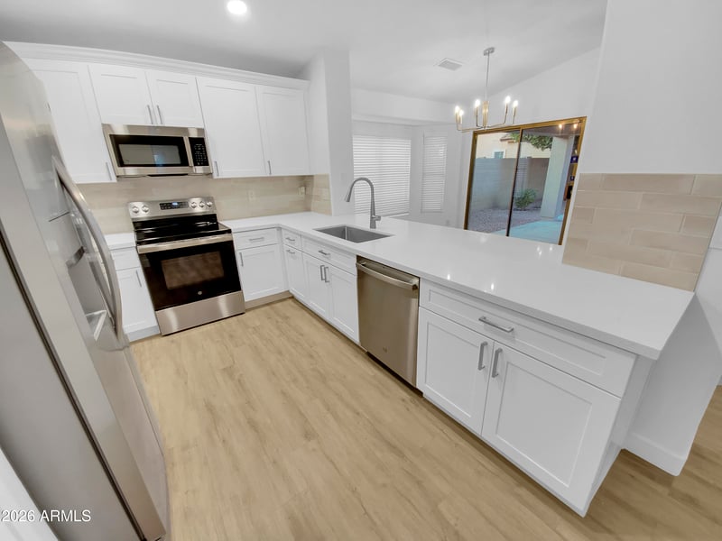 Listing details for 16844 Statler St, Surprise, AZ 85388 : Welcome to 16844 W Statler St, a home that has been tastefully updated with fresh interior paint and partial flooring replacement. The kitchen is a chef's dream with all stainless steel appliances, complemented by an accent backsplash. Vaulted ceilings. The primary bedroom boasts a spacious walk-in closet. The primary bathroom is a sanctuary featuring a separate tub and shower, and double sinks for convenience. Outside, The fenced-in backyard is perfect for privacy and comes with low maintenance landscaping. Covered patio extends the living space. This home is a must-see for those seeking a move-in ready property. Included 100-Day Home Warranty with buyer activation
