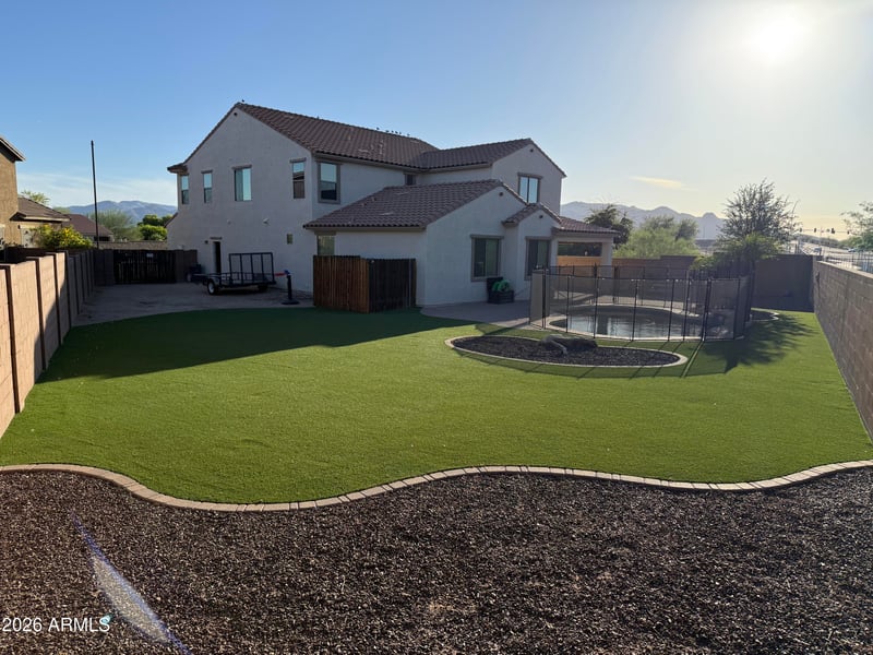 Listing details for 16903 183rd Ln, Surprise, AZ 85388 : Nestled in a desirable cul-de-sac with stunning mountain views, this beautifully maintained home offers elegance and functionality. The main level features tile flooring, a private owner's suite with dual vanities, soaking tub, separate shower, and walk-in closets, plus a den. The formal living area boasts vaulted ceilings, and the open kitchen includes granite countertops, large pantry, and breakfast nook overlooking the family room. Upstairs offers a loft, four bedrooms, Jack-and-Jill bath, full bath, and laundry. The backyard features a Pebble Tec pool with variable speed pump, pavers, turf, and RV gate, plus a huge side yard for your toys. Borders common area with ample parking for holiday guests. 3-car tandem garage with insulated door, 220V, some windows have tint, programmable thermostat, and radiant barrier roof for efficiency. Owner/Agent