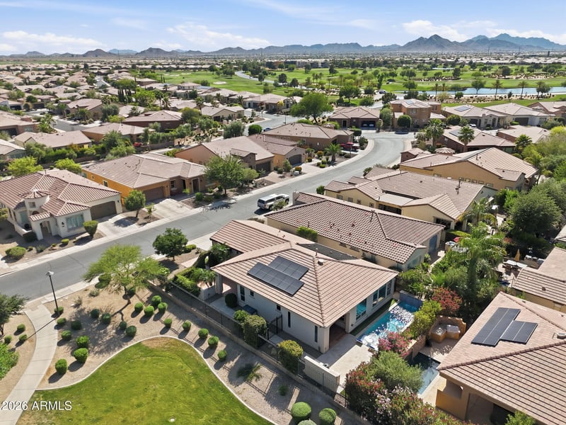 Listing details for 1694 Grand Ridge Rd, Queen Creek, AZ 85140 : Location, Location, Location! Beautifully upgraded Monaco model with solar, perfectly situated next to a large private greenbelt for added privacy. Enter through a stunning Spanish archway with iron gate into a tiled courtyard. Inside, enjoy a great room with surround sound and tile flooring in the main areas. The bright kitchen features an island, pantry, raised panel cabinets, granite counters, and a dining nook overlooking the courtyard. The primary suite offers dual sinks, walk-in shower with seating, and a spacious closet. Step outside to a covered patio with a gas fireplace, extended seating area, and a solar heated pool--perfect for relaxing or entertaining. Fresh interior and exterior paint too! Make Encanterra your home in 2026!
