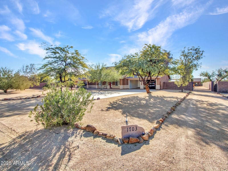 Listing details for 1703 Maddock Rd, Phoenix, AZ 85086 : Looking for room to breathe and space to create? This one-owner gem in Desert Hills checks all the boxes! Set on a fully fenced acre, you'll love the open layout, gorgeous porcelain tile with stone inlays, and upgraded kitchen with granite counters and new appliances. The backyard is the perfect spot to unwind—think sparkling pool, built-in BBQ, beehive fireplace, and raised garden beds. Need space for hobbies or toys? The detached 1,980 sf garage is a dream! With Cave Creek water, fire district protection, and a new septic tank, this home is as practical as it is peaceful. Come see why this one's a rare find!