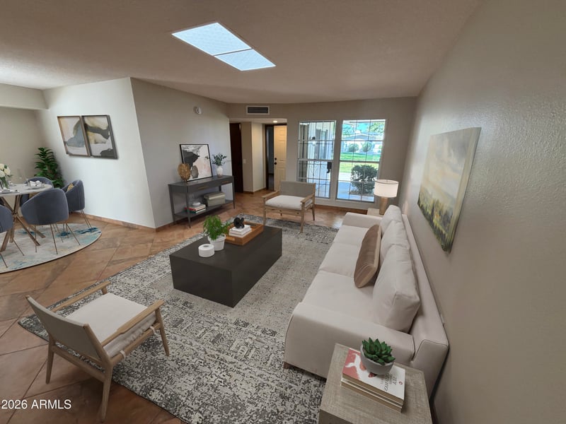 Listing details for 17034 105th Ave, Sun City, AZ 85373 : 2-bedroom, 2-bathroom, 1-car garage. Recent updates include interior paint, kitchen cabinetry, countertops, and appliances. The garage floor has an epoxy coating. The interior features tile flooring throughout and includes an additional bonus room. The rear yard is improved with low-maintenance turf landscaping. The property is located within an age-restricted 55+ community with golf course amenities.