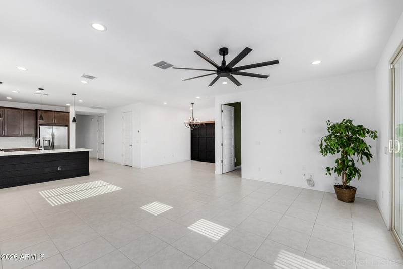 Listing details for 17122 Artemisa Ave, Surprise, AZ 85387 : ***PRICED TO SELL! *** More upgrades than the new builds! This 2023 SmartHome, located in a quiet 55+community was gently lived in by part-time owners. Enter through a beautiful custom steel door into a thoughtfully upgraded home featuring high ceilings, large wood ceiling fans, oversized tile flooring, dimmer switches, and upgraded carpet in the bedrooms. The kitchen offers dark wood cabinets with crown molding, stainless steel bar pulls, an undermount sink, newer appliances includes a gas stove, and quartz countertops that double as a breakfast bar. An open den with a board and batten wall can easily function as a dining area. The large laundry room provides shelving for storage. Owned water softener and tankless gas water heater is in the garage. The spacious primary suite features a stylish shiplap accent wall and backyard views providing a restful retreat. The ensuite bath includes a custom barn door, large walk-in tiled shower with grab bars, dual sinks with a step-down quartz vanity, framed mirrors, and oversized walk-in closet. A secondary bedroom and full bath are privately located toward the front of the home.