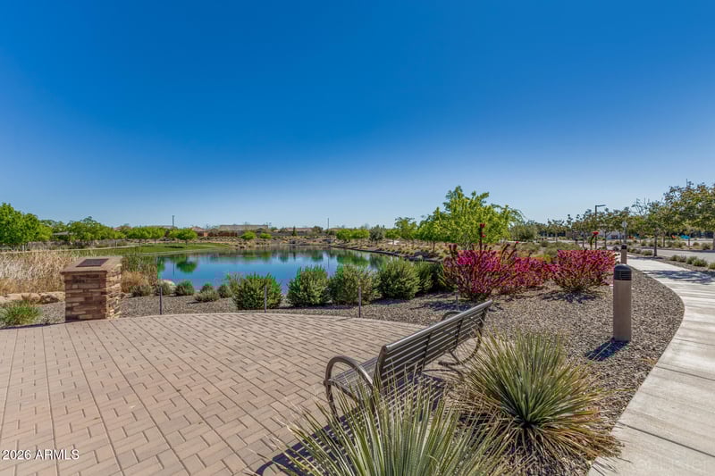 Enjoy a beautifully landscaped backyard with raised planters, mature plants, premium artificial turf, brick pavers, custom lighting, and a covered patio. The clubhouse with heated pools, pickleball, fitness center, fishing lake, putting green and more is walking distance from the home. Shopping, dining, and freeways are minutes away!!