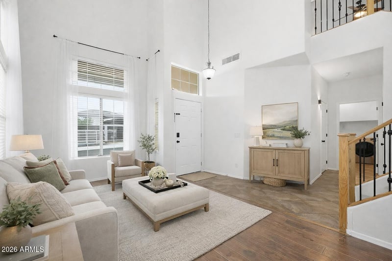Listing details for 17156 Young St, Surprise, AZ 85388 : Located in the established community of Surprise Farms in Surprise, AZ, this spacious 2-story home offers 2,000+ sq ft of well-designed living space just minutes from Prasada, major shopping, dining, neighborhood parks & convenient freeway access. From the moment you enter, soaring vaulted ceilings in the formal living & dining areas create an open, light-filled layout that enhances the overall square footage. The floorplan flows seamlessly into the main living space, complete with a fireplace & views of the private backyard. The kitchen is designed for everyday functionality & entertaining, featuring generous counter space, ample cabinetry, recessed lighting, a breakfast bar, walk-in pantry, reverse osmosis system (Aug 2025), newer microwave (Dec 2024) & dishwasher (Feb 2025). Upstairs, the versatile loft provides flexible living space ideal for a home office, media room, playroom, workout area, or second family room. The primary suite offers dual sinks, a separate tub & shower, & a well-balanced layout that provides both comfort & privacy. Step outside to a backyard built for Arizona living, complete with a covered patio, sparkling pool, built-in BBQ & recently updated pool filtration system (July 2024) perfect for outdoor entertaining & year-round enjoyment. Additional major updates include HVAC replaced March 2025 & water heater replaced January 2025, offering peace of mind for the next owner. This Surprise AZ home with pool & loft combines space, thoughtful updates, location & lifestyle in one of the West Valley's established neighborhoods.