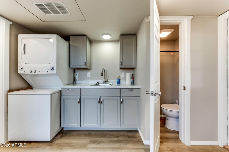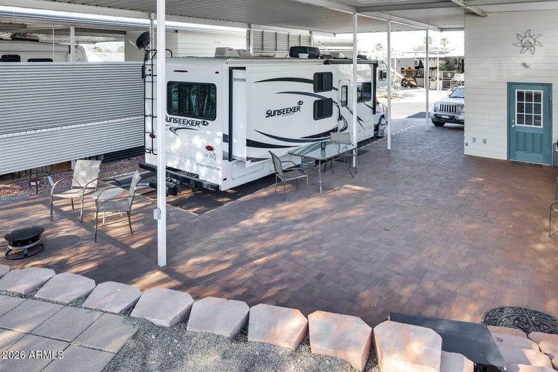 Listing details for 17200 Bell Rd #722, Surprise, AZ 85374 : This RV lot checks all the right boxes. Beautiful golf course view - yes. Very few available in Happy Trails. A fully covered lot with 13ft 8' awning for complete protection for your home on wheels. Privacy fence on both sides so you can enjoy your home without prying eyes and entertain in quietness. And check out all the pavers on the entire property. Stunning!!!!! A two story shed with all the essential perks. Newer W/D(2024), a great handy sink with spacious countertops. A frig for all your extras and best of all it has and enclosed toilet. The flooring is luxury vinyl for that classy look and the upstairs if finished for a great storage area.