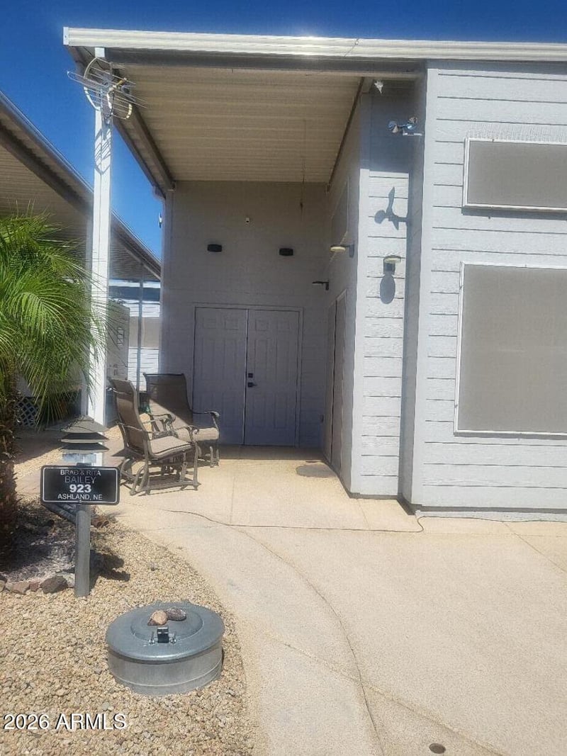 Listing details for 17200 Bell Rd #923, Surprise, AZ 85374 : Own your lot in Happy Trails with this quality site-built, ground-level 1 bed / 1 bath home -- all on one level with no interior or exterior stairs. Features include a large main bedroom with walk-in closet, walk-in shower, 9' ceilings, and a wide open living / dining / kitchen floor plan. Desirable north/south exposure, spray foam insulation, and Low-E dual pane windows enhance comfort and efficiency. Kitchen offers custom cabinets and stainless appliances, plus stack washer/dryer inside. Outside enjoy a 14' high RV cover with hookups that accommodates most RVs and a large attached shed for storage. Low HOA fees include water, sewer, trash, amenities, pools, pickleball, fitness, clubs, and activities.