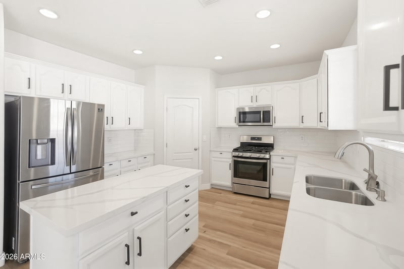 Listing details for 17328 Bajada Rd, Surprise, AZ 85387 : This beautifully remodeled home challenges comparison! From the bright, open floor plan with 5 bedrooms and 3 baths to the backyard oasis with a large pebble-tech self cleaning pool and spa to the outdoor kitchen with travertine countertops, BBQ, gas stovetop, and a large fireplace you can enjoy. The indoor kitchen features luxury Calacatta quartz countertops, a large pantry, kitchen island, subway tile backsplash, stainless steel appliances with a gas stove, and recessed lighting. Other features include new luxury vinyl flooring and carpet throughout, quartz countertops in the bathrooms, a tankless hot water heater, and new ceiling fans throughout. Upstairs, you'll find a large bonus room, a spacious primary bedroom with a master bath featuring a dual-sink vanity, a walk-in closet, and a separate tub and shower. A Jack and Jill guest bathroom with a dual sink vanity, and a guest bedroom downstairs with a full bathroom. All situated in the great community of Desert Oasis with a community pool, parks, and walking trails. This home is exceptionally clean and truly move-in ready. Come see it today before it's gone!