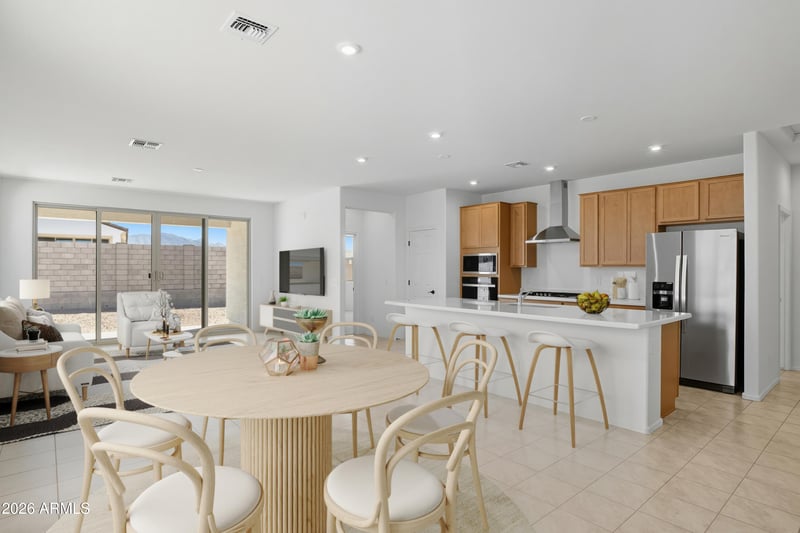 Listing details for 17353 Desert Sage Dr, Goodyear, AZ 85338 : Welcome to this beautiful single-story home located in the heart of Goodyear. This stunning new construction home has 3 bedrooms and 2 bathrooms, offering ample space for comfortable living. The 1841 sq ft home includes a spacious great room, a modern gourmet kitchen, and cozy dining room. The primary suite boasts a large closet while the additional bedrooms provide plenty of room for family or guest. Step outside to enjoy the large patio on 6461 sq ft lot, perfect for entertaining and relaxing. Additional highlights include upgraded kitchen counters, cabinets, tile throughout with carpet in the bedrooms, and a 2-car garage. Located in the desirable Estrella masterplan featuring 2 state-of-the-art residents clubs including fitness centers and pools.