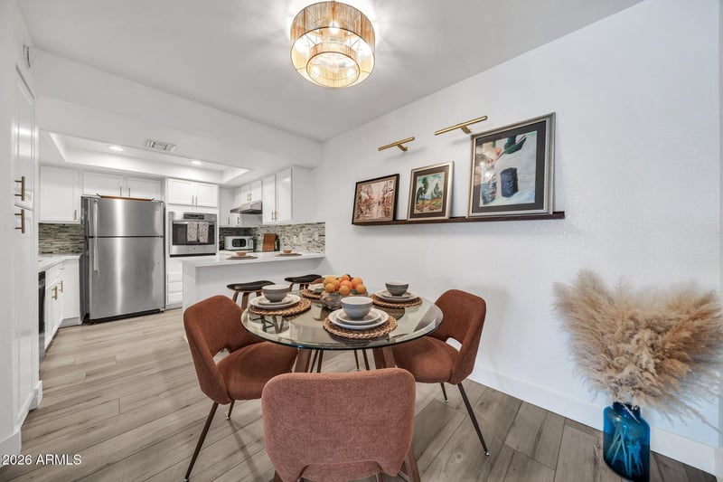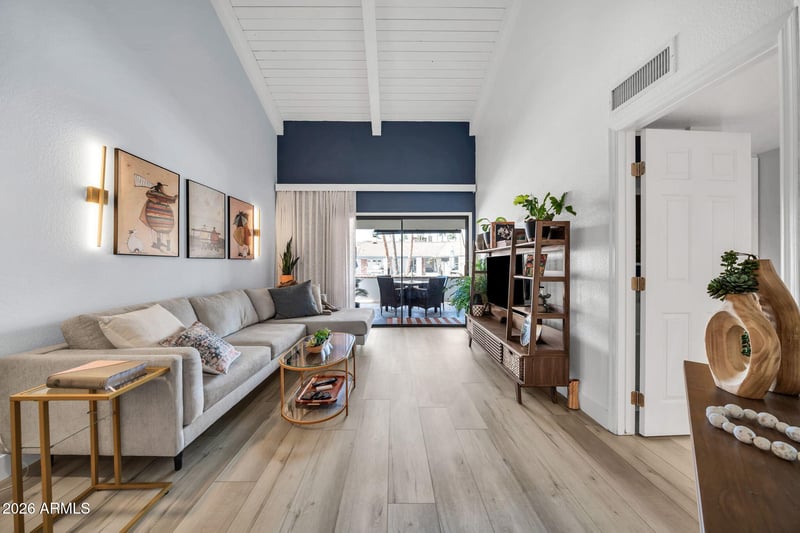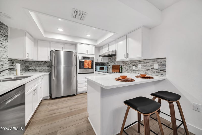 Listing details for 17404 99th Ave #102, Sun City, AZ 85373 : Rare opportunity to own one of only two 1-bedroom units in The Heritage featuring high, beamed, white-washed vaulted ceilings that create an open, light-filled space with a beachy vibe. This updated ground-floor unit offers wide-plank luxury vinyl flooring, fresh interior paint, new lighting, remote-controlled living room drapes, blackout bedroom drapes, and a new stackable washer and dryer. The kitchen and bath feature solid-surface countertops, plus a walk-in shower, new dishwasher, refrigerator with icemaker, and reverse osmosis. HVAC serviced 2/26. Enjoy a private flagstone patio, gated parking, storage, and golf cart space. Resort-style 55+ amenities and prime location near golf, recreation, shopping, and dining.