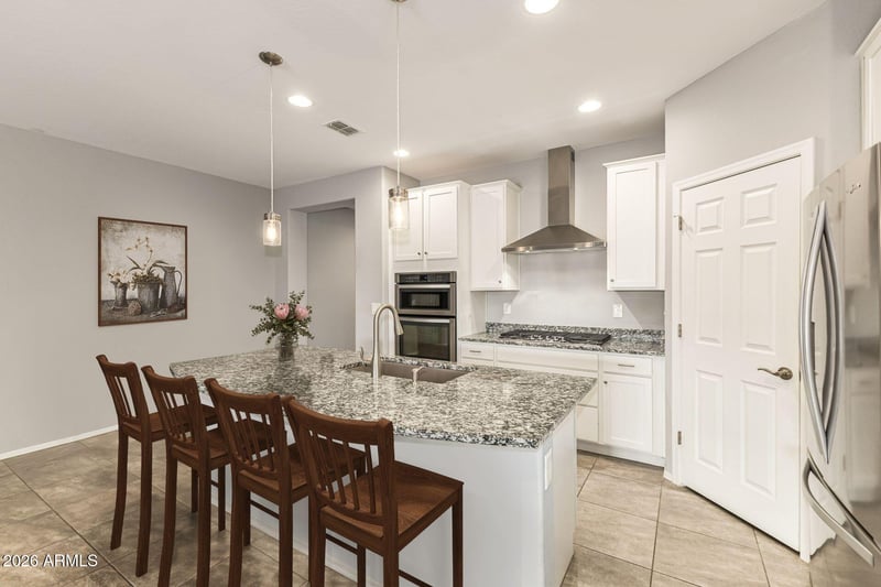 The heart of the home is the gourmet kitchen, and it truly stands out. Crisp white cabinetry, granite countertops, a large island with custom pendant lighting, and a walk-in pantry create a spa that is both beautiful and functional. The built-in 5 burner gas cooktop, stainless steel range hood, and double ovens, including a microwave convection combo, make this kitchen ideal for everyday living and entertaining alike.