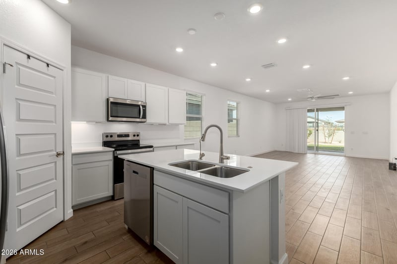 Listing details for 17628 Mission Ln, Waddell, AZ 85355 : Better than new! Built in 2024, this meticulously maintained residence offers the perks of new construction with all the finishing touches already complete. The functional 5-bedroom, 3-bathroom floor plan features a popular three-way split layout, ideal for privacy. The heart of the home is an expansive great room with durable wood-look flooring and abundant natural light. A gourmet kitchen shines with quartz countertops, white cabinetry, stainless steel appliances, a walk-in pantry, and a large center island with seating. The primary suite includes a generous walk-in closet and dual-sink vanity. Enjoy a low-maintenance backyard oasis featuring a covered patio and professional artificial turf, perfect for year-round entertaining. Turnkey and ready for immediate move-in!