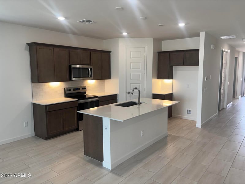 Listing details for 17747 Purdue Ave, Waddell, AZ 85355 : Spacious and Stylish 4 bed with Den. Home features White Shaker style cabinets, quartz countertops, a classic subway tile backsplash & farmhouse sink. Upgraded kitchen appliances, 9ft ceilings, 8ft. interior doors throughout, 8ft glass slider at patio creates an open airy feel. 6x24 tile in all areas except bedrooms and closets. Thoughtfully designed with modern finishes-
