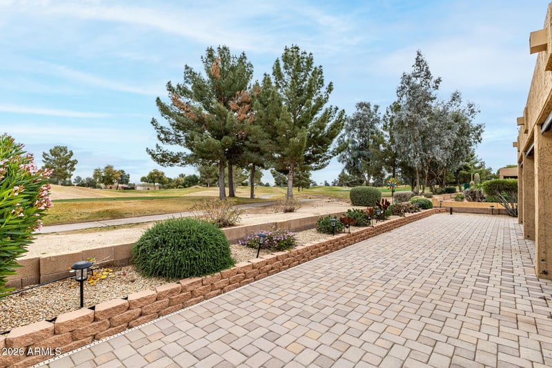 The great room floor plan connects the main living, dining, and kitchen areas, creating a functional layout for everyday living and hosting. The split bedroom design provides separation betwe primary and secondary spaces, and the den offers flexibility for a home office or additional living area. The kitchen features granite countertops, updated appliances, oak cabinetry, and a central island with bar seating. The secondary bathroom includes an upgraded walk-in shower, and additional interior features include extensive tile flooring, custom window coverings, built-in surround sound, and upgraded ceiling fans. Outdoor living is positioned along the golf course with an extended covered patio and pavered backyard designed for low maintenance. Features include remote-control patio shades and cooling misters, with eastern rear exposure that reduces late afternoon heat and supports more consistent outdoor use throughout the year. The property is located within the Arizona Traditions community, a gated, age-restricted neighborhood with golf and recreational amenities. Monthly HOA is $205, with additional fees outlined in community documents. If you are comparing golf course homes in Arizona Traditions, this property stands out for its combination of energy efficiency, system updates, and position on the course.