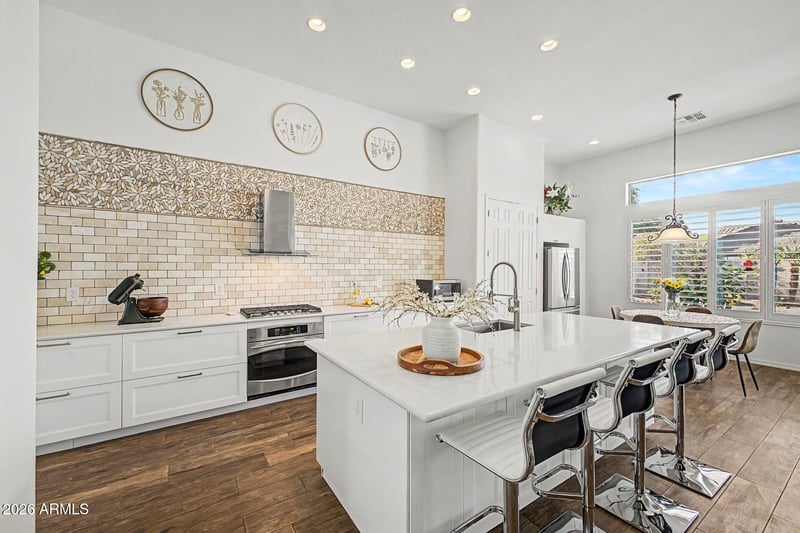 Listing details for 18014 El Caminito Dr, Waddell, AZ 85355 : Fully reimagined and truly spectacular, this POOL home showcases a stunningly remodeled, modern kitchen that serves as the heart of the home, featuring custom cabinetry with double pull-out and lighted interior drawers, designer backsplash, a redesigned pantry and butler's pantry. OWNED solar means $0 Electric BILLS! This Sunset model home offers 4 large bedrooms, including one with it's own private ensuite, a large den/office that could serve as a 5th bedroom, and convenient guest half bath. The luxurious primary suite offers a spa-like retreat with soaking tub, walk-in shower and redesigned closet. Enjoy 12 ft ceilings, gas fireplace, shutters throughout and a 3 car garage with custom cabinetry. Backyard paradise with pool, water feature, extended patio and outdoor living spaces. This home is something special. From the moment you walk in, you can feel the level of care, intention and investment that has gone into every space.